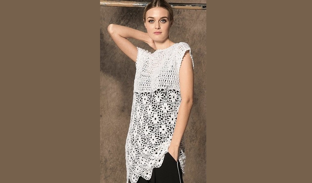 На тунике из белых льняных ниток цветочные мотивы дополнены простым узором, образующим полоски.