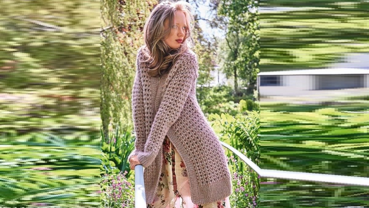Вам потребуется: 550 (600) 650 г пряжи цвета пудры Lang Yarns «Merino 130» (100% шерсти; 130 м/50 г) и 350 (400) 400 г пряжи цвета увядшей розы Lang Yarns «Malou Light» (72% шерсти альпака, 16% полиамида, 12% овечьей шерсти; 190 м/50 г); крючок № 6; спицы № 4,5; круговые спицы № 4,5.