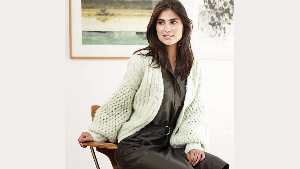 Достаточно короткие полочки и спинка выполнены эластичной резинкой на спицах, в то время как экстравагантные объемные рукава — пышными столбиками крючком.