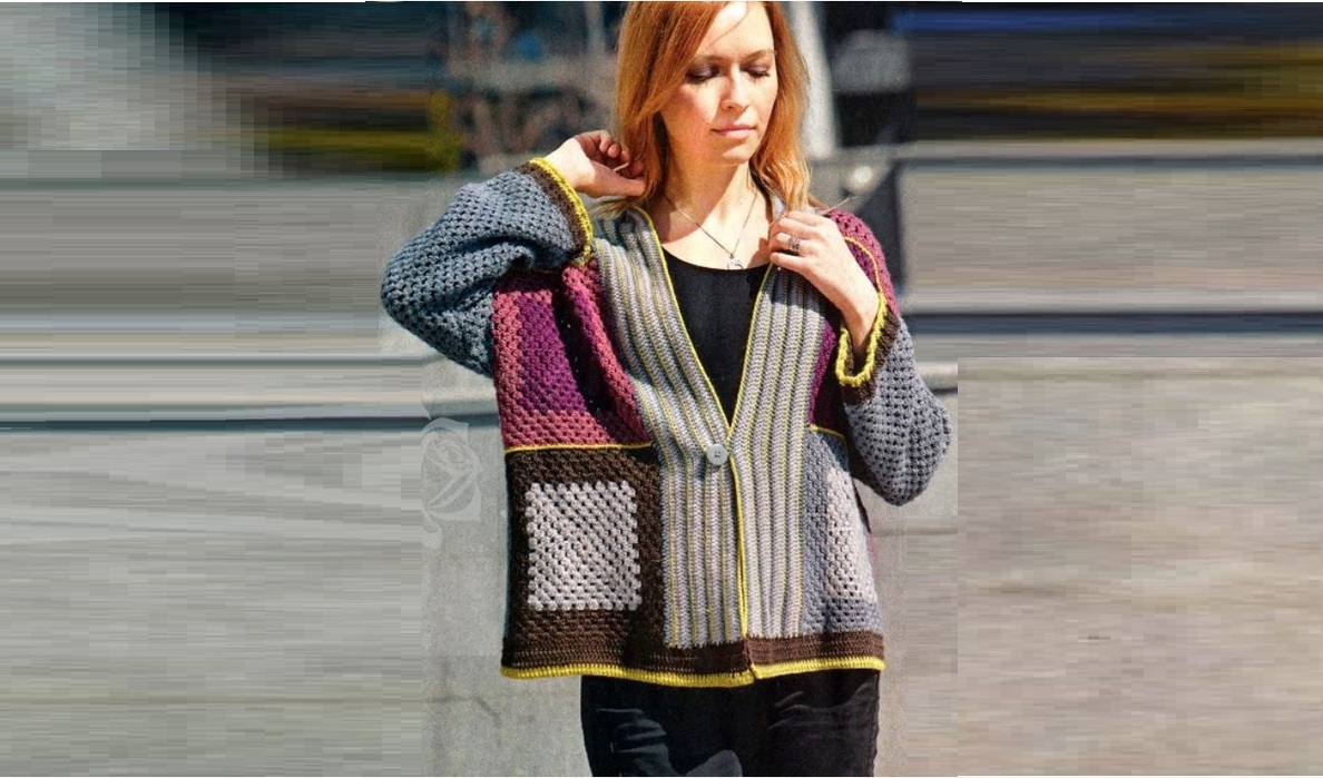 Новое звучание популярного вязаного элемента. На этот раз квадраты разного размера и цвета украшают модный кардиган свободного кроя.