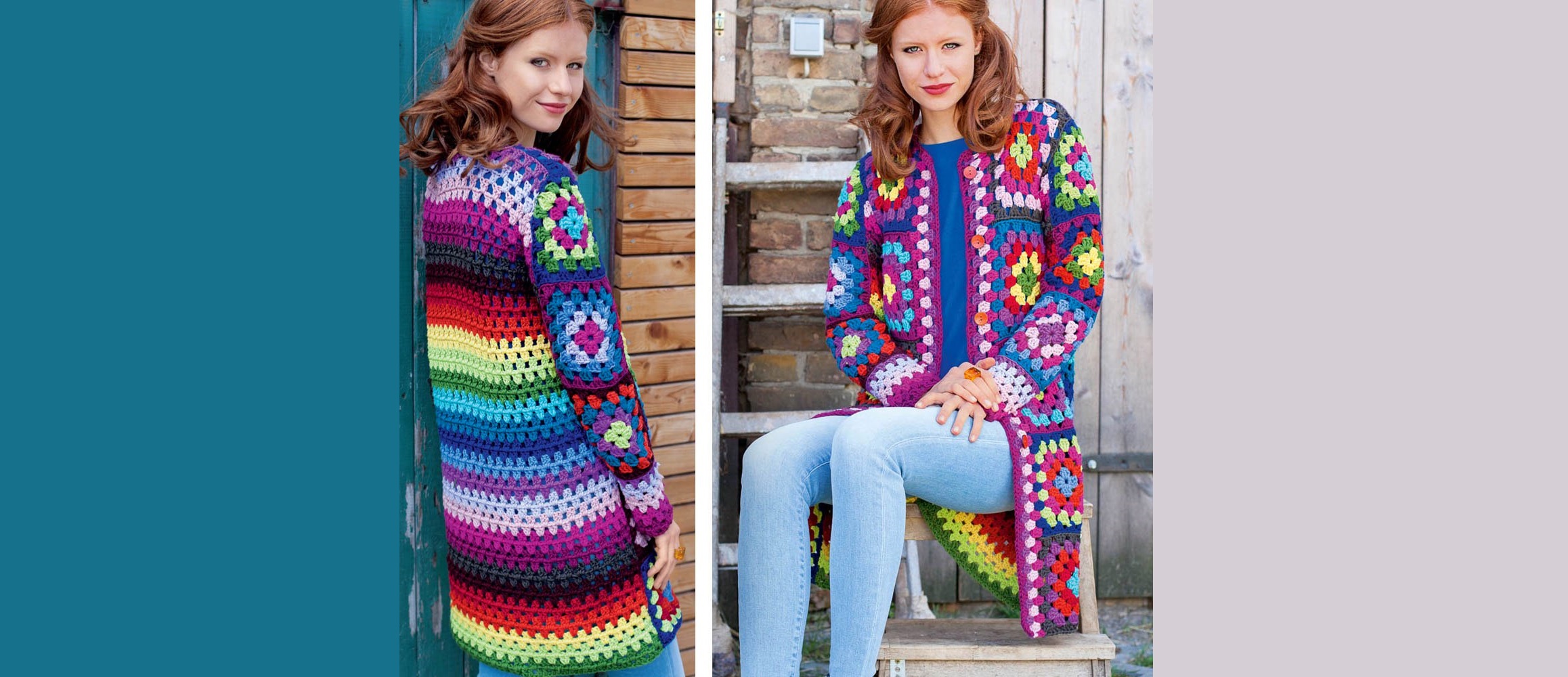 Вы можете связать это пальто и очень ярким, как в предлагаемом варианте, и выбрать более спокойные сочетания цветов.