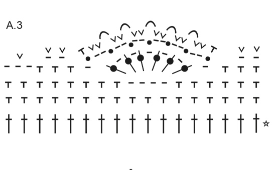 Продолжайте вязать, как показано в схеме А.3, начиная со 2-го ряда. Выполнив схему А.3, обрежьте и закрепите нить.