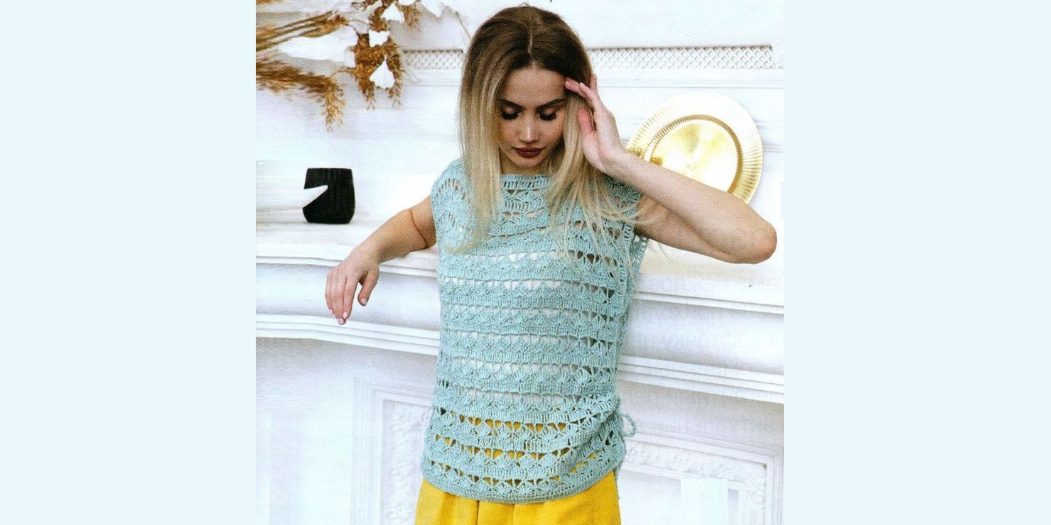 Для топа прямого силуэта выбрали пряжу с легким сиянием люрекса. По бокам модели есть разрезы, но нам захотелось собрать их на шнуровку. А как вам больше нравится?