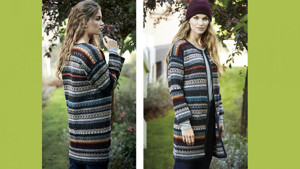 Узоры в этом кардигане несложные в исполнении, но обилие разных цветов пряжи потребует от вас внимания.
