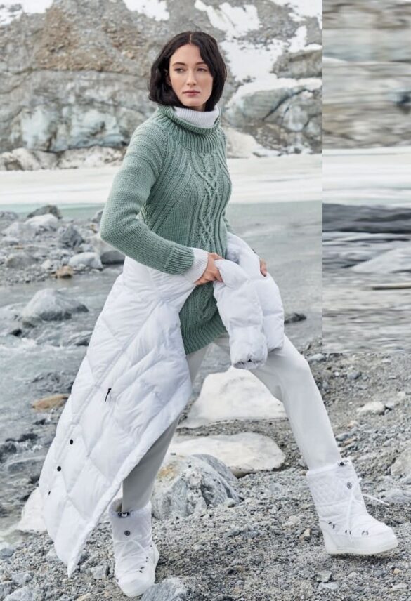 Сверху вниз — именно так вяжется этот пуловер в рустикальном стиле: начинаем с объемного воротника гольф, затем выполняем кокетку с хитроумным переплетением «кос» и заканчиваем эластичной резинкой, мягко подчеркивающей контуры фигуры.