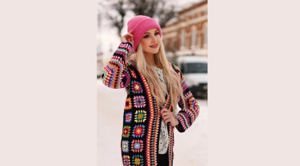 Вы можете связать это пальто и очень ярким, как в предлагаемом варианте, и выбрать более спокойные сочетания цветов.