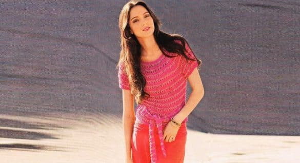 Необычный дизайн джемпера с короткими рукавами, который вяжется сверху вниз круговыми рядами, достоин комплиментов.