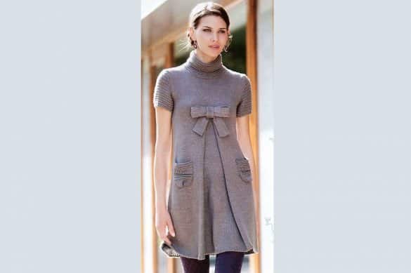 Это стильное платье спицами выполняется из мериносовой шерсти с добавлениям акрила. Эффектная складка легко прячет любые недостатки фигуры.
