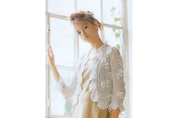Ажурный нарядный жакет связан из белоснежной пряжи крючком и украшен мотивами ирландского кружева.