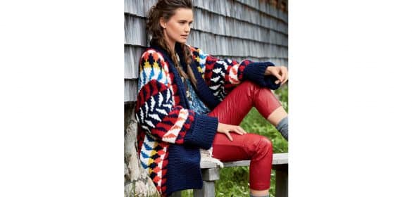 This beautiful bright oversized cardigan model simply amazes with its colors and style. A wrap-around spacious cadigan in ethno style is assembled from two fabrics, each of which is knitted from the sleeve.