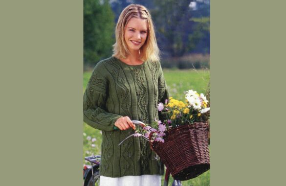Простой пуловер темно-зеленого цвета, связанный спицами. Рисунок состоит из чередования полос лицевой глади, и растительного узора с листиками. Изгибающиеся "стебли" смотрятся очень эффектно, и создают рельеф всей модели.