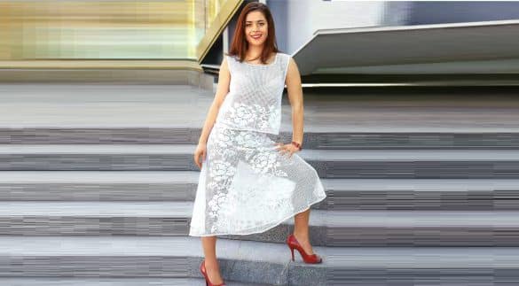 Чистый белый цвет в сочетании с серебристо-серым выглядит просто и элегантно. Широкая серая полоса по низу трапециевидного ажурного платья гармонирует со стальной цепочкой в виде бретелей