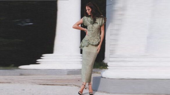 A magnificent suit of soft green color consists of an openwork, unusual cut blouse and a straight, narrow skirt.
