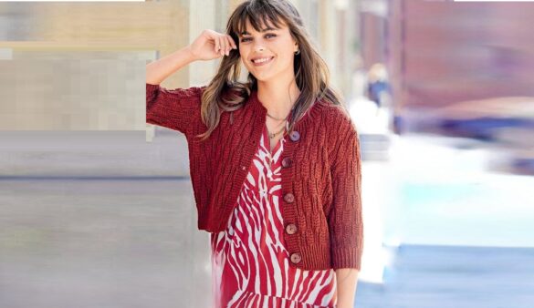 A short jacket with three-quarter sleeves and a button fastening is knitted with a pattern of small “braids” made of wool blend yarn and is ideally combined with other items of the spring wardrobe.