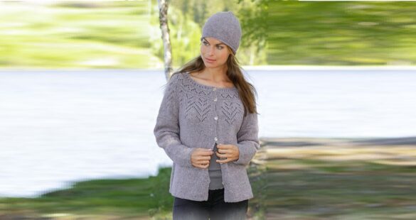 A classic pullover with wide sleeves that gather over the cuffs, made with an elastic band, knitted with an openwork “Leaves” pattern made of 100% cotton.