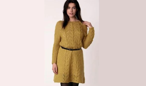 This warm casual dress is knitted from yarn with a high mohair content. Great for the cold season.