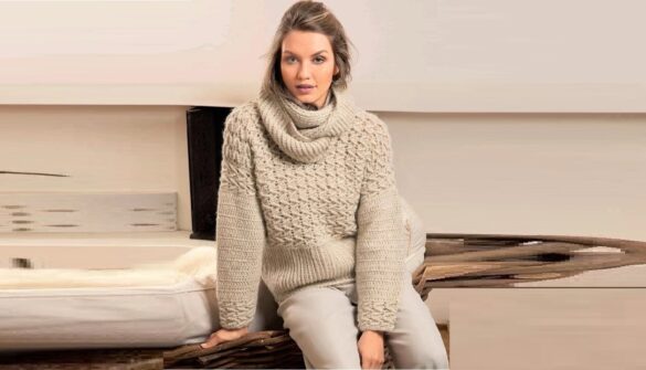 Широкий шалевый воротник связан плетеным узором. На спинке, полочках и рукавах «косы» скомбинированы с ребристыми узорами из перекрещенных петель. В результате получилась очень эффектная и по настоящему универсальная модель для любого случая!