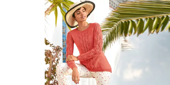 Легче не придумаешь: обе части переда и спинки вяжутся единым полотном без плечевого шва, а затем соединяются посередине, образуя аккуратный V-образный вырез. Если узор кажется вам слишком прозрачным, наденьте вниз топ на тонких бретелях.