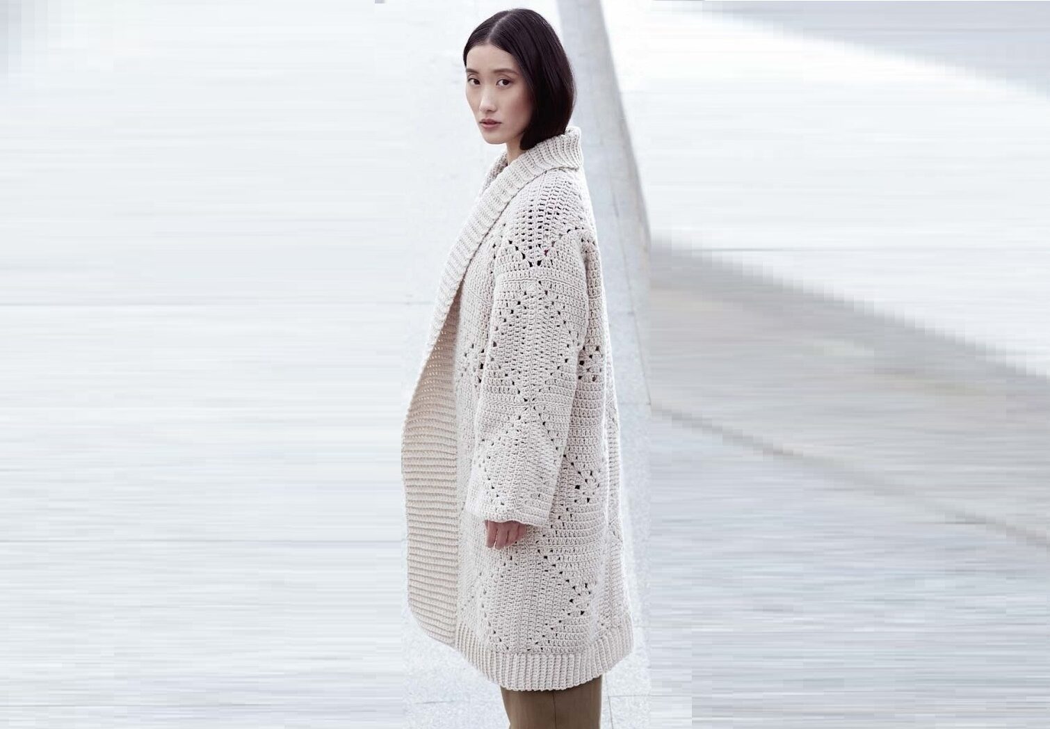 В главной роли – всем известный «бабушкин квадрат». Именно он взят за основу нашего пальто, исключительный характер которого также обусловлен пряжей из тончайшей мериносовой шерсти (всего 18 микрон!) с добавлением полиамида.