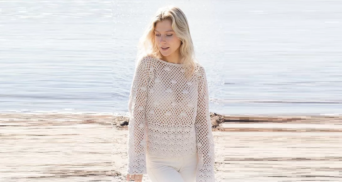 You will need: пряжа DROPS Belle (53% хлопка, 33% вискозы, 14% льна; 50 г/ 120 м) – 550-600 – 650-700 – 750-850 г жемчужно-белой (цв. 26). Крючок: № 4.