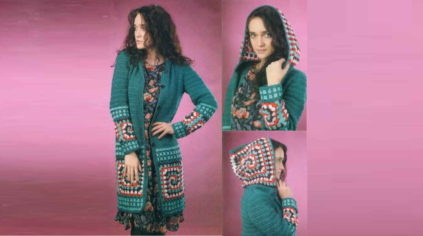 A warm coat with a hood can easily claim to be a hit in the spring wardrobe thanks to the decor of colored squares knitted in a spiral.