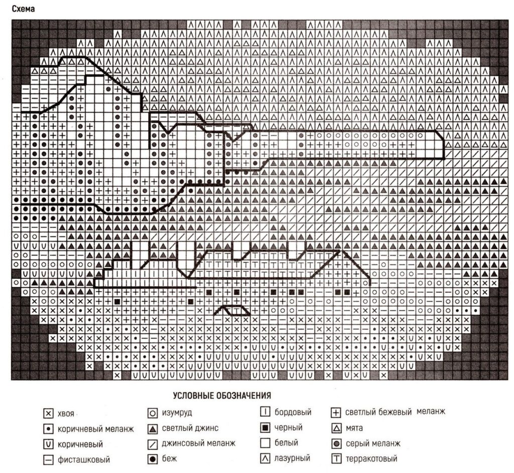 Для рисунка потребуется пряжа следующих цветов: лазурь, мята, фисташка, хвоя, изумруд, белый, беж, св. бежевый меланж, серый меланж, карамельно-коричневый, коричневый меланж, терракотовый, бордо-вый, св. джинс, джинсовый меланж, черный.