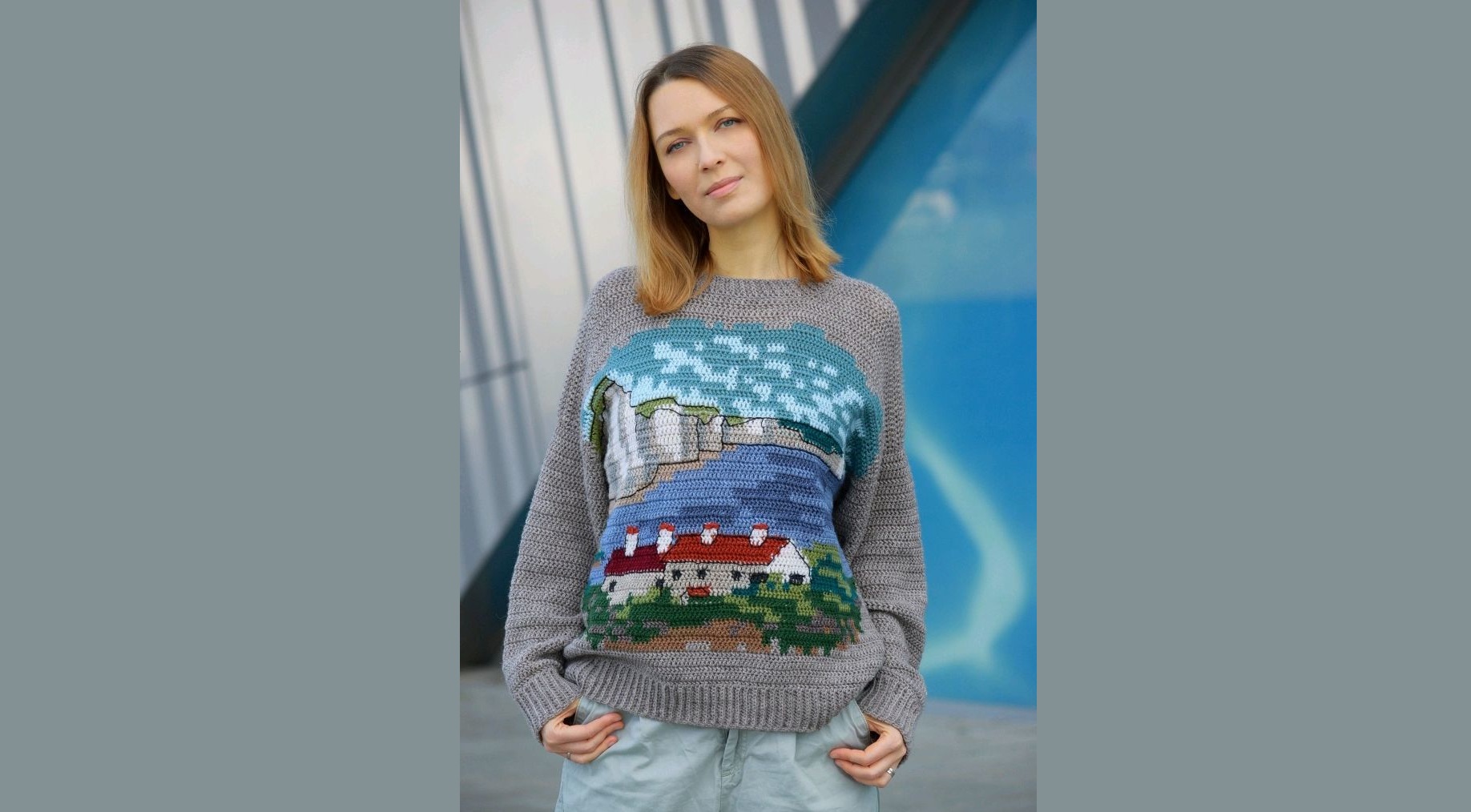Словно кусочки мозаики, собираются разноцветные петли в настоящую картину. Джемпер с морским пейзажем прекрасно подойдет для летней прогулки, а зимой будет напоминать о чудесном отпуске.