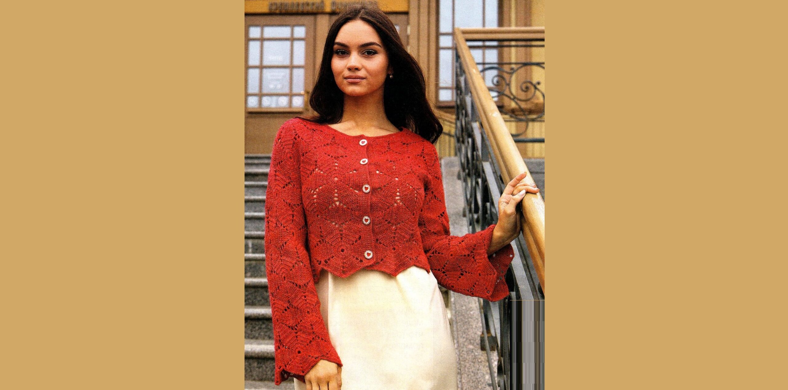Шестиугольные мотивы, соединяясь между собой, превращаются в эффектный жакет сочного красного цвета. Декор в виде контрастных пуговиц с сердечками создает модный акцент.