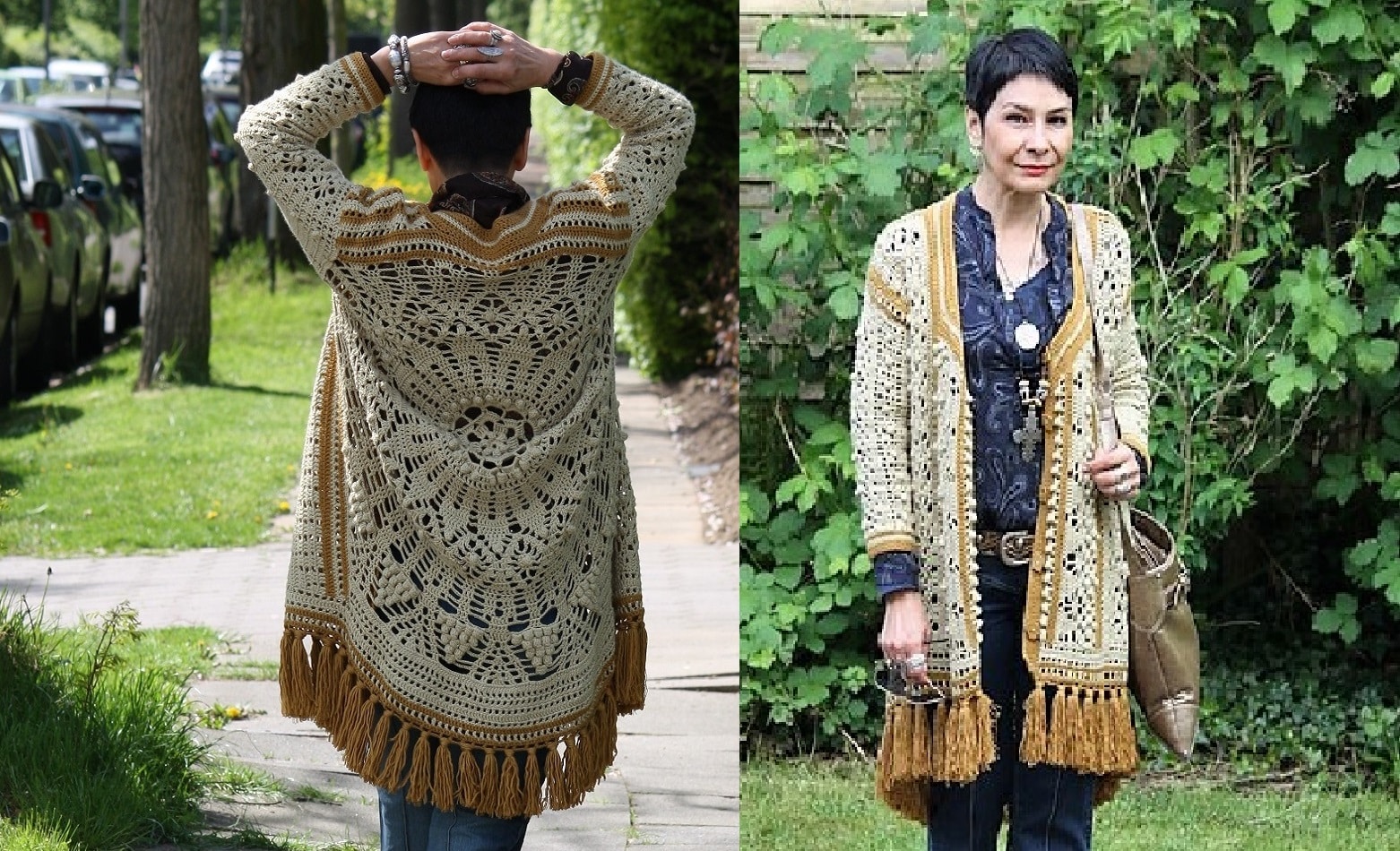 The “hippie” style manifested itself recklessly and colorfully, rejecting established rules, principles and trends, so crocheted products are favorites of this style, when it is possible to safely mix not only colors, but also patterns, a striking example of which is a cardigan, actively decorated with another popular element - fringed.