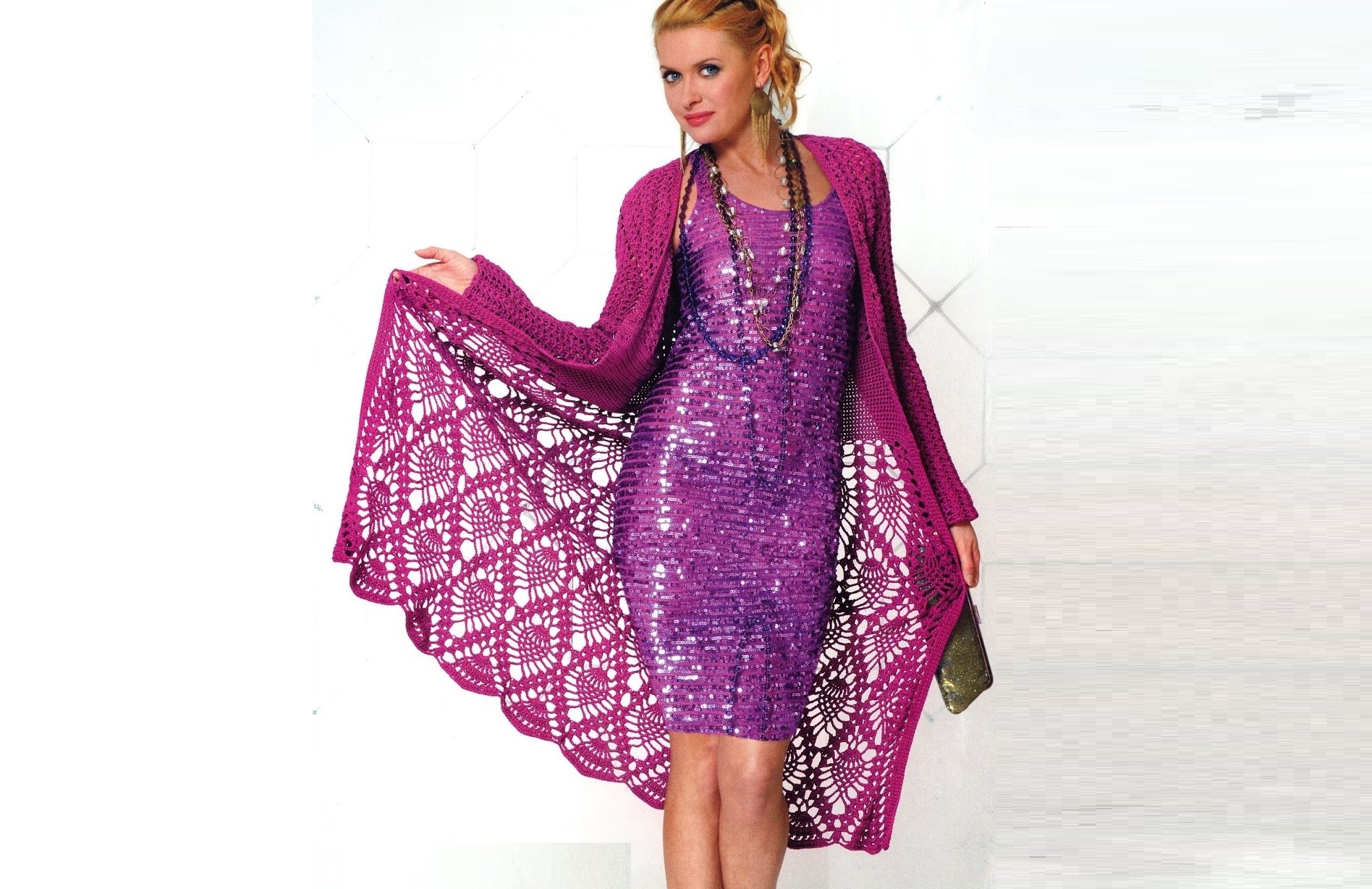You will need: 1000 г пряжи цвета фуксии (100 % хлопок, 440 и х 100 г), вязание выполняется в две нити, крючок N° 3,5; 3 стеклянных пуговицы в тон пряжи.