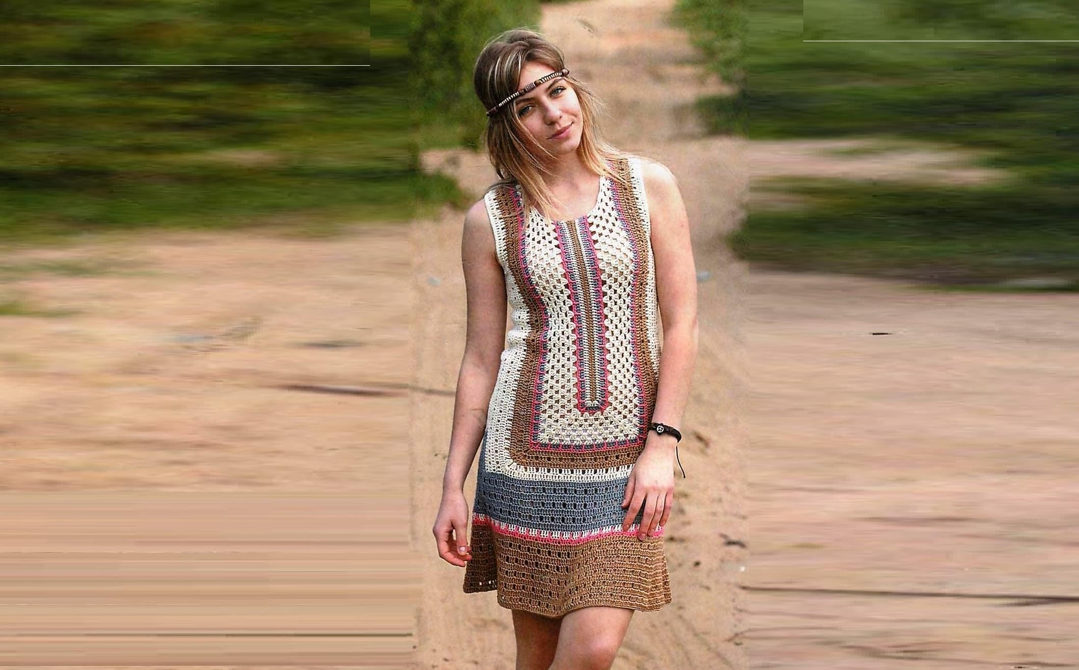 A new look at ethnic style. The dress with a geometric pattern is knitted from bamboo fiber in delicate pastel shades.