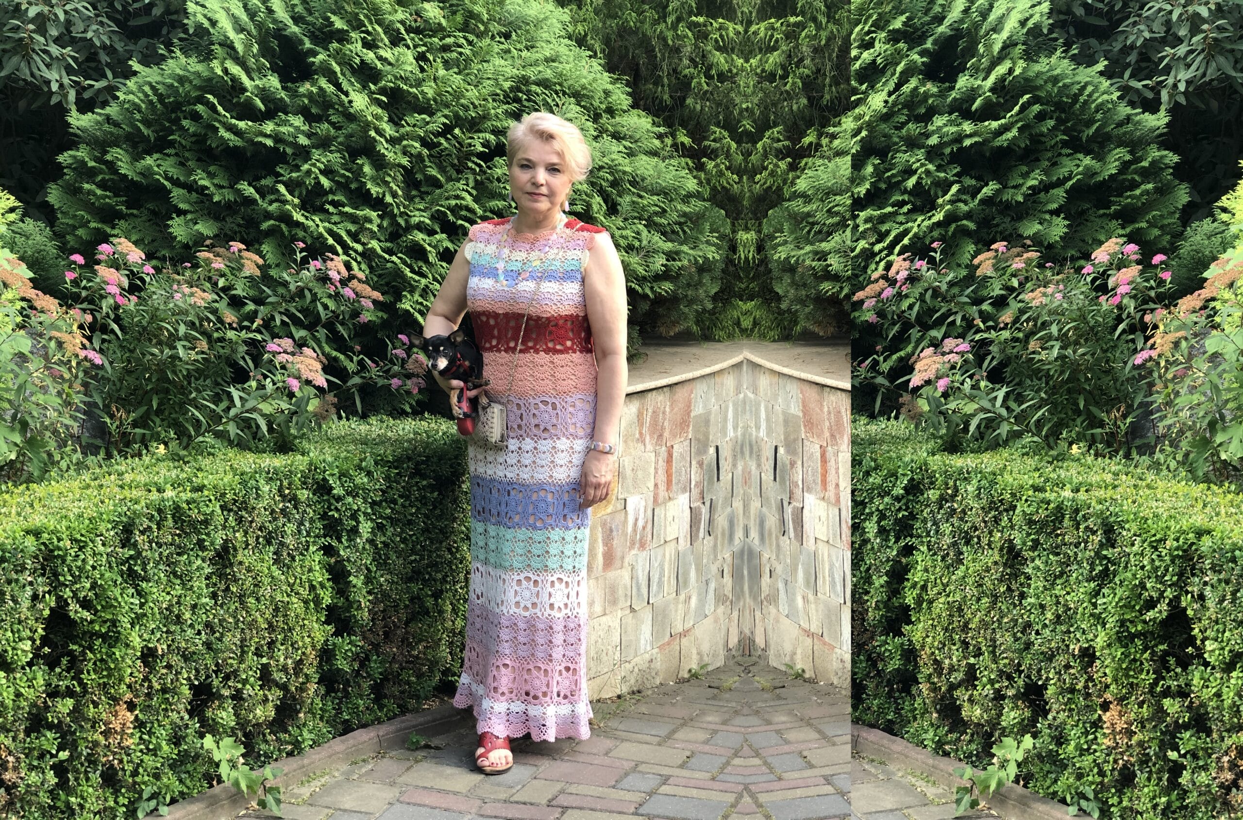 Bright summer dress made of square motifs.