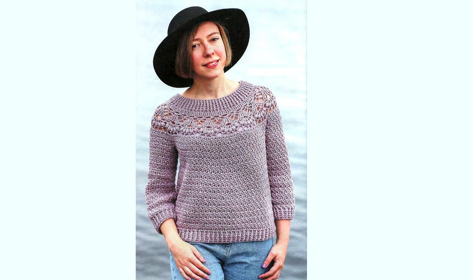 A dusty rose-colored pullover with an openwork yoke looks luxurious and sophisticated. We are sure that you have long dreamed of such a thing!