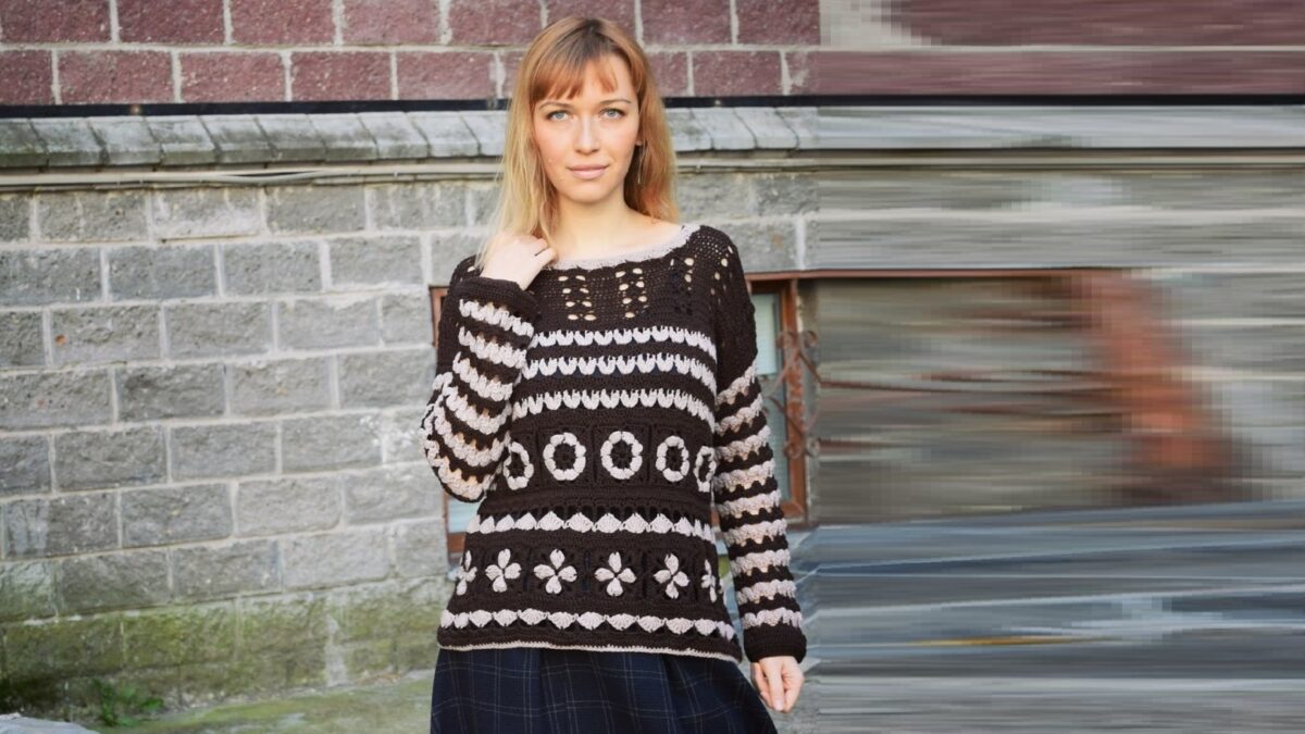 Openwork fans and cones echo the floral squares, and the pleasant brown harmonizes well with the powdery shade. You must knit this pullover with ethnic elements.