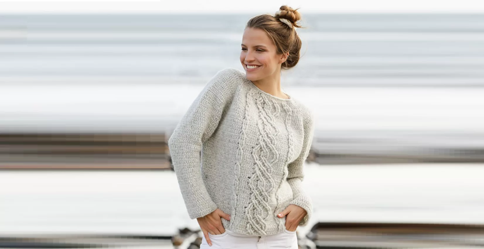 Пуловер реглан с узором «Косы» и рельефными петлями. Подлинная изюминка этой новинки – объемная «коса» по центру переда.