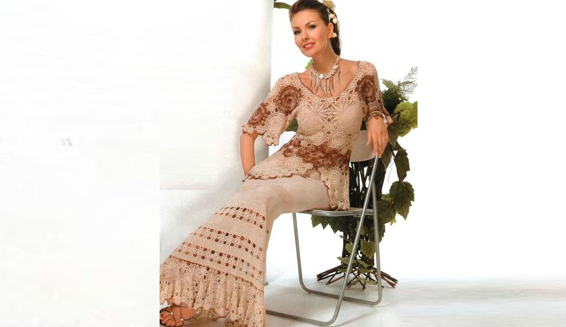 Роскошный вязаный костюм, легкий, ажурный, женственный, своим мягким пастельным цветом он лишь подчеркивает скромное изящество узора выполненного крючком.