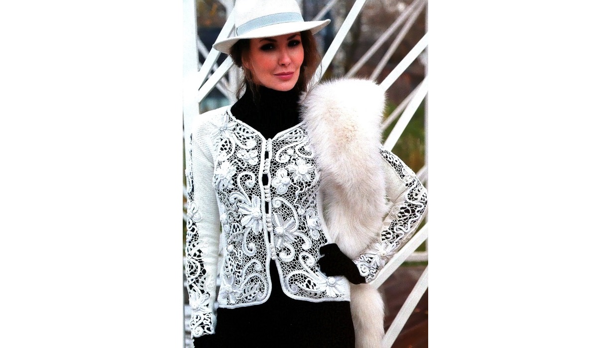 Полочки и рукава состоят из деталей со вставками из ирландского кружева.