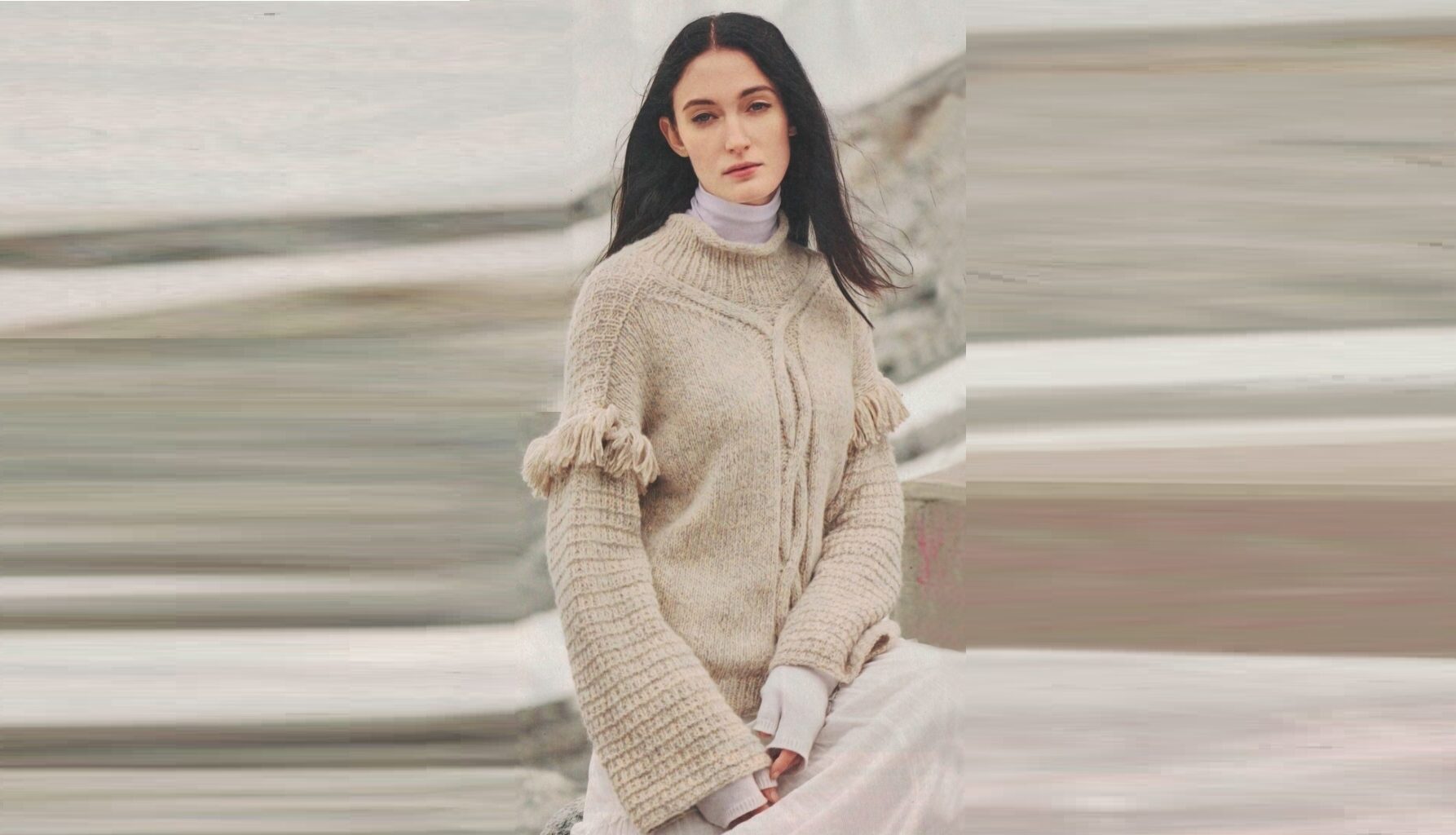Кремовые оттенки в трикотаже олицетворяют благородство и элегантность. Изюминка данного вязаного пуловера — расходящаяся вверху «коса» и широкие рукава, отделанные бахромой.