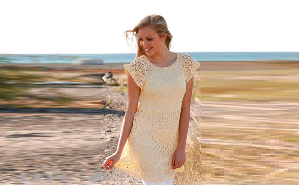 В итоге получится прекрасная туника светлого жёлтого цвета. Её можно носить с белыми брюками или шортами, но не обязательно белыми. Такая туника, лёгкая и прозрачная, жизнерадостного цвета, отлично будет выглядеть и на зелёном, и на коричневом, и на тёмно-синем фоне. Горловина, оставляющая открытой шею и ключицы, отделана кантиком, так же, как и низ изделия, а рукавчики – зубчиками. Лиф в стиле «принцесс» связан платочной вязкой, а рукавчики-регланы и низ туники, начиная, от кокетки, выполнены лёгкой ажурной вязкой. Рукавчики отделены от лифа рельефом. Надо заметить, что рукавчик «реглан» больше подойдёт к прямым плечам, нежели к покатым, учитывайте этот момент при выборе модели. Зато все остальные детали туники пойдут любой женщине, не вызывая сомнений и не особенно оглядываясь на детали фигуры. И каждую женщину она украсит, добавив жизни и красок в солнечный летний день