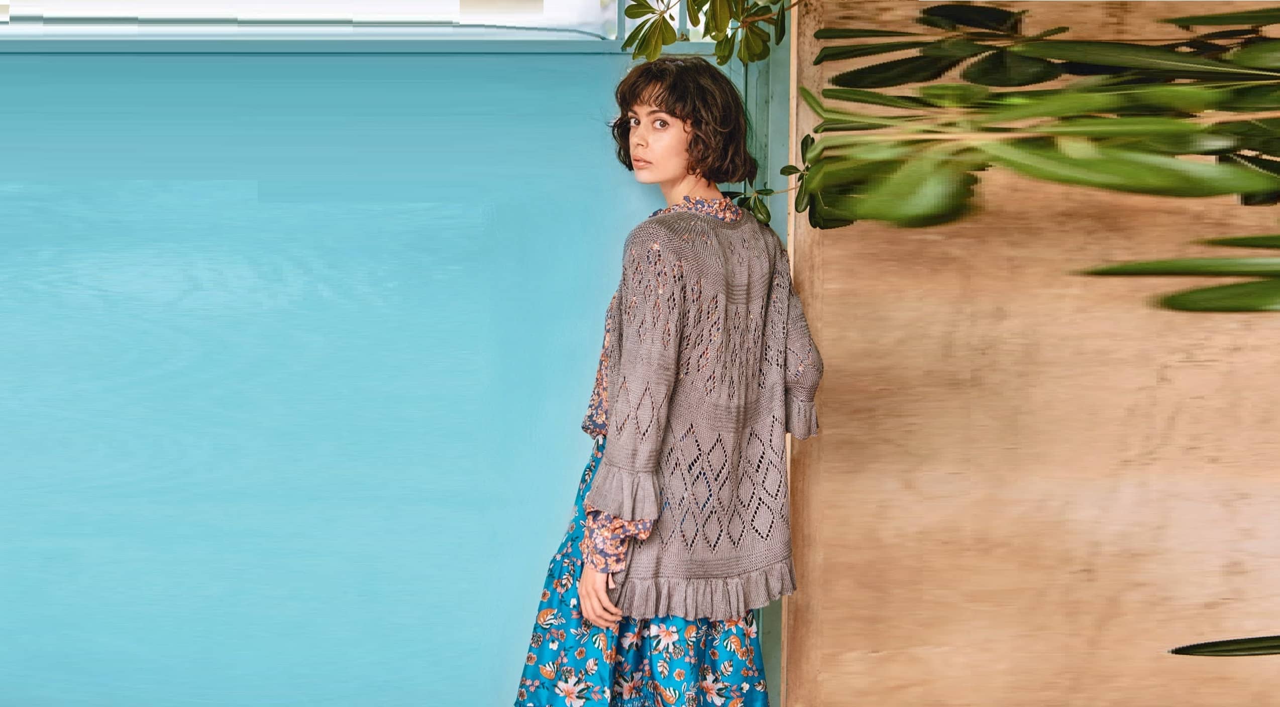 Цельновязанный кардиган с рюшами без застежки связан ажурными узорами из вискозы и жемчужного волокна в серо-коричневом цвете спицами № 4.