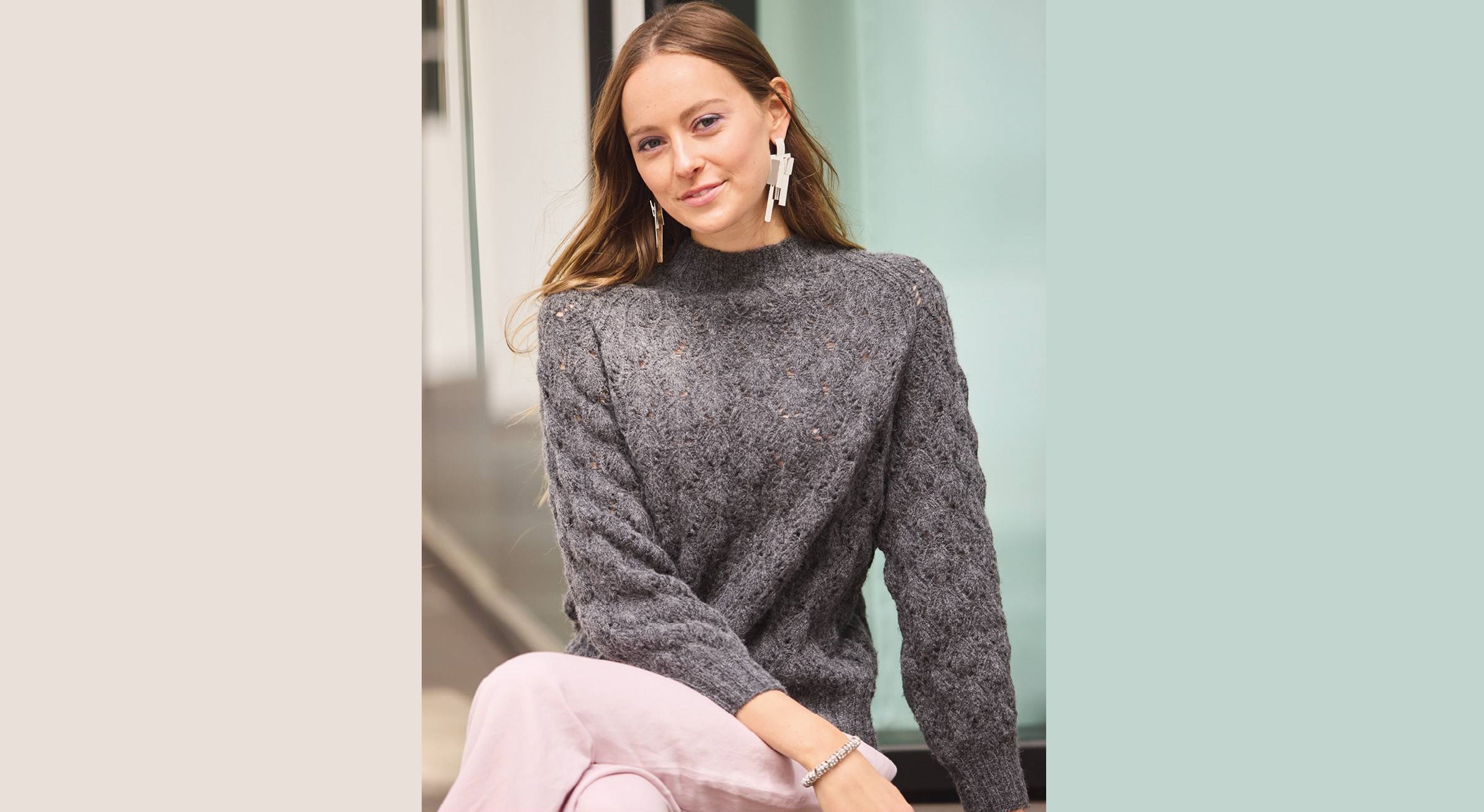 Благодаря флоральным мотивам вы будете расцветать даже в темно-сером пуловере! Ажурный растительный узор оживляет вязаное полотно и придает этой модели женственный вид, который подчеркивается воздушно-легкой пряжей с цепочной структурой.