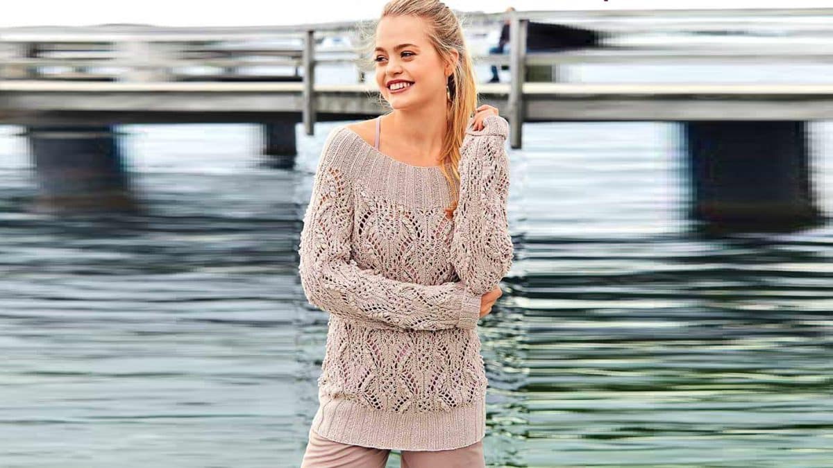 Красивый ажурный узор с «шишечками», смесовая пряжа на основе хлопка, широкая горловина – все привлекает в этом пуловере цвета пудры.