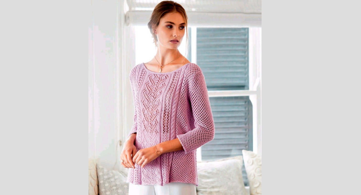 Великолепный ажурный пуловер, связанный на спицах из хлопковой-шелковой пряжи нежно-розового цвета фантастическим сочетанием узоров.