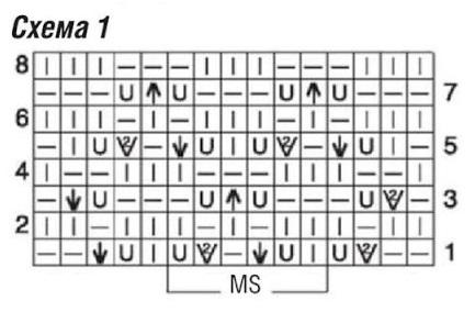 Узор 4: рельефный узор (число петель кратно 6 + 3 + 2 кромочные). Вязать согл. схеме 2. На ней даны лицевые и изнаночные ряды. Начать с 1 кромочной, раппорт постоянно повторять, закончить петлями после раппорта и 1 кромочной. Выполнить 1 раз 1-4-й р., затем еще 3 раза повторить 3-й и 4-й р. = всего 10 р.