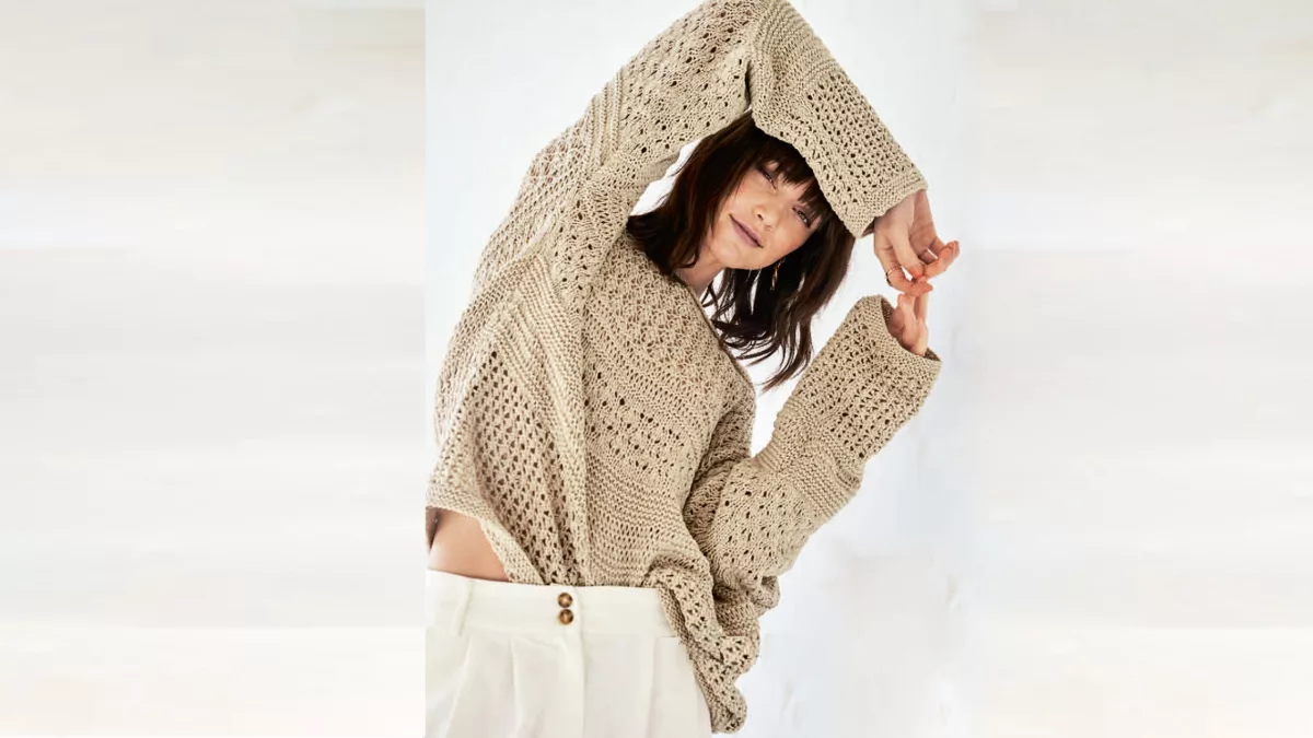 Свободный летний пуловер связан спицами сочетание горизонтальных ажурных узоров их хлопка с шерстью бежевого цвета.