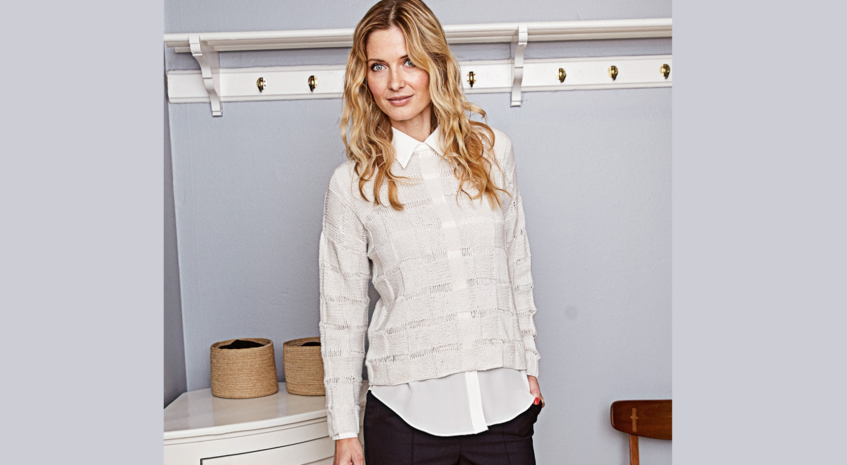 В этом узоре чередуются клетки, выполненные лицевой и изнаночной гладью, а ряды клеток обрамляют горизонтальные полосы петель, образованных за счет сброшенных дополнительных накидов.