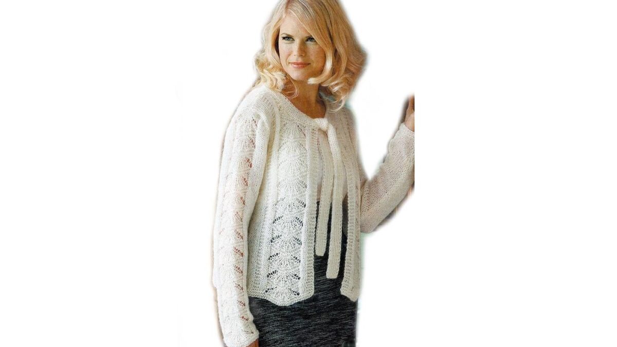 Right shelf: наберите 43(47)50(54)57 (61) п., вяжите 5 рядов платочной вязкой. Далее вяжите следующим образом: 4 п. платочной вязкой, затем провяжите ажурный узор (= 23 п. + 2 п.), 3 п. платочной вязкой и 13(17)20(24)27(31) п. лиц. гладью. Ажурный узор повторяйте с 1-го по 10-й ряд. На высоте 12 см для приталивания убавьте с левой стороны 1 п. Повторите убавления через каждые 2,5 см еще 3 раза. На высоте работы 21 (22)22(23)23(24) см прибавьте с левой стороны 1 п. Повторите прибавление через 4 см еще раз. На высоте работы 34(35)36(39)40 см закройте для проймы с левой стороны в каждом 2-м ряду 1 раз х 3(4)4(5)5(6) п., 1(1)2(2)3(3) раза х 2 п. и 2(3)2(3)3(4) раза х 1 п.