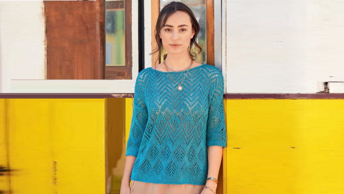 A straight-cut pullover with three-quarter sleeves and a dynamic structure made of various openwork elements is suitable for any figure