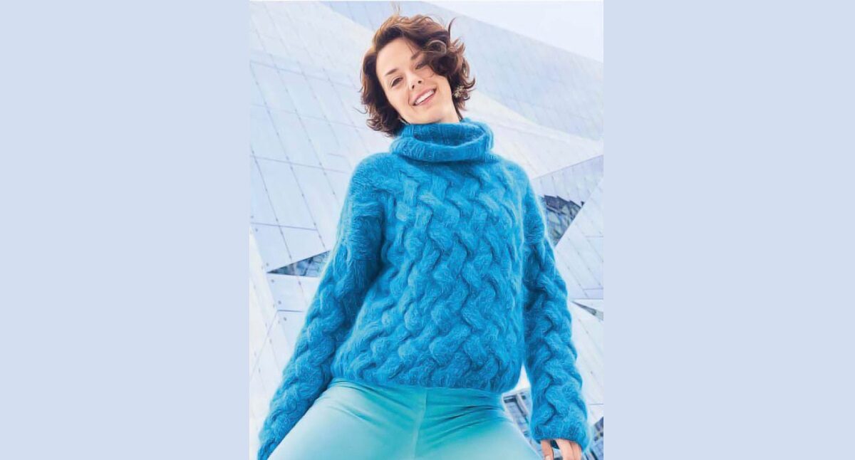 Теплый пуловер из смесовой мохеровой пряжи с роскошным воротником гольф источает невероятную энергию благодаря яркому бирюзовому оттенку и крупному плетеному узору.