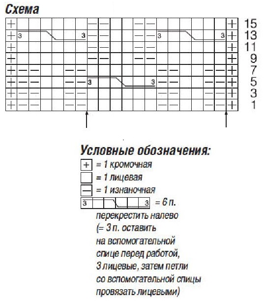 Вязать по схеме. На ней даны только лицевые ряды; в изнаночных рядах петли провязывать по рисунку. Начать с 1 кромочной, постоянно повторять раппорт из 12 п. между стрелками, закончить 0 (0) 6 п. после левой стрелки и 1 кромочной. Постоянно повторять 1-16-й р.
